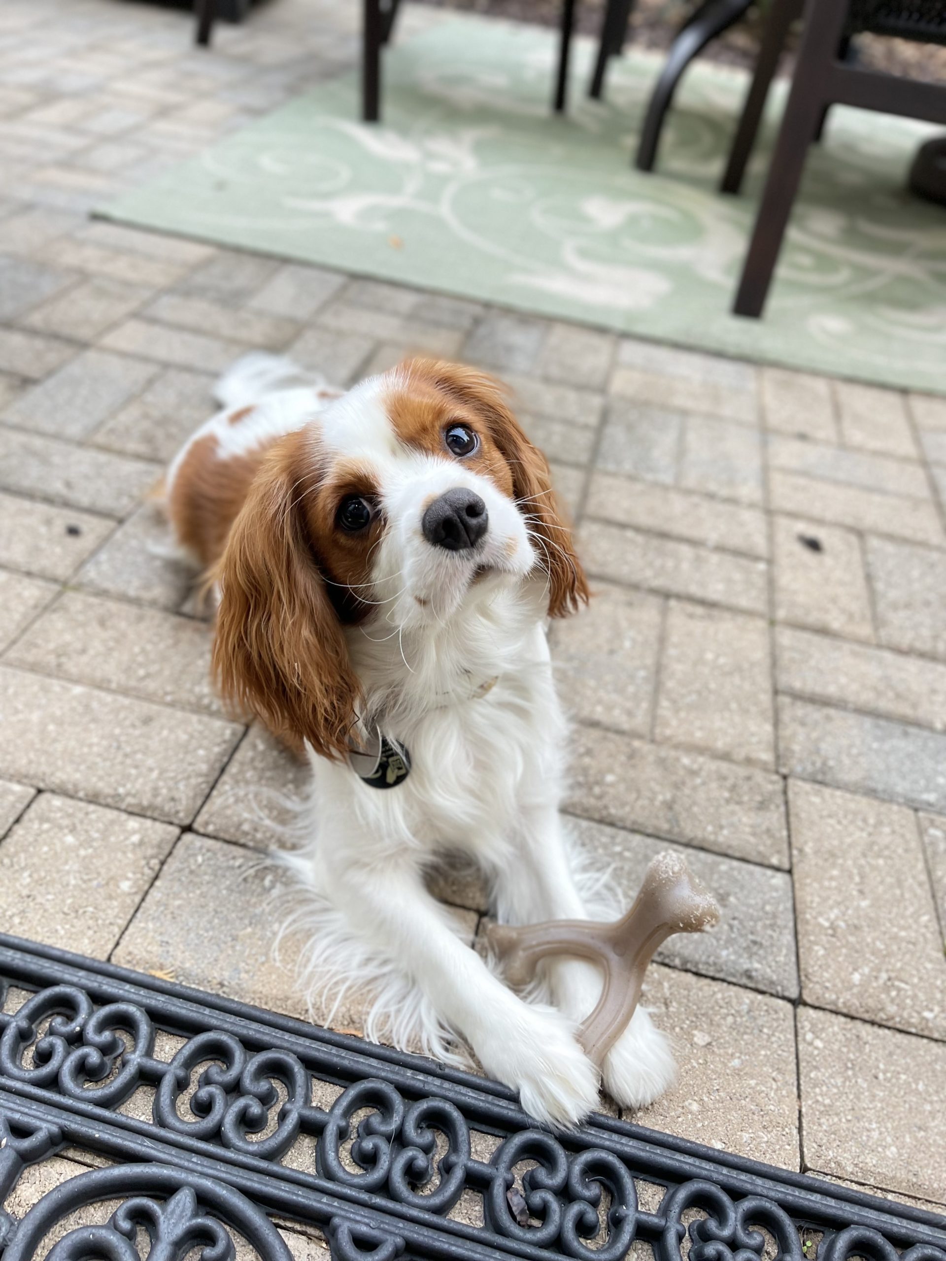 I am housebroken and I ring a bell when I need to go outside. I’m a very smart boy! I do bark when there’s someone at the door. And I bark at other strange animals and strange humans when I’m in the yard. I love being outdoors. Loud noises like the vacuum and thunderstorms scare me. I get along with humans all sizes and all ages. I also get along with other dogs, but I haven’t been around any large dogs yet. I also have spent some time with puppies and a cat. They don't bother me at all. I do love to play with toys. Sometimes i get a bit rough with them and they need to go to the dog toy hospital for repair.